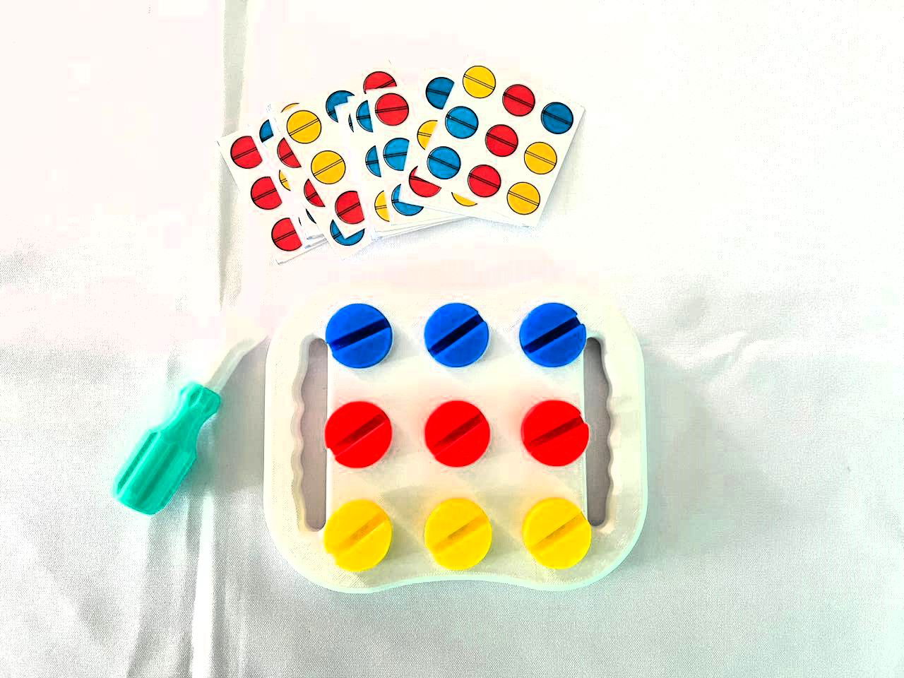 ENROSCADOS es un juego didáctico pensado para desarrollar la motricidad fina, la precisión manual y las habilidades cognitivas tempranas. Incluye un tablero resistente, 9 tornillos de tres colores, un destornillador ergonómico y un set de tarjetas de desafíos que guían al niño a completar patrones, secuencias y combinaciones.