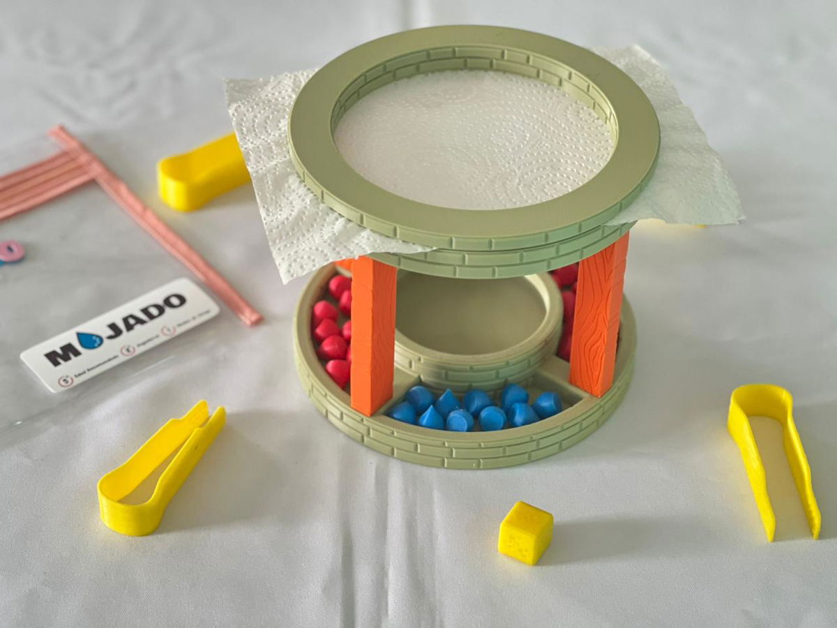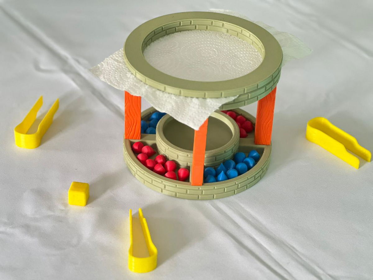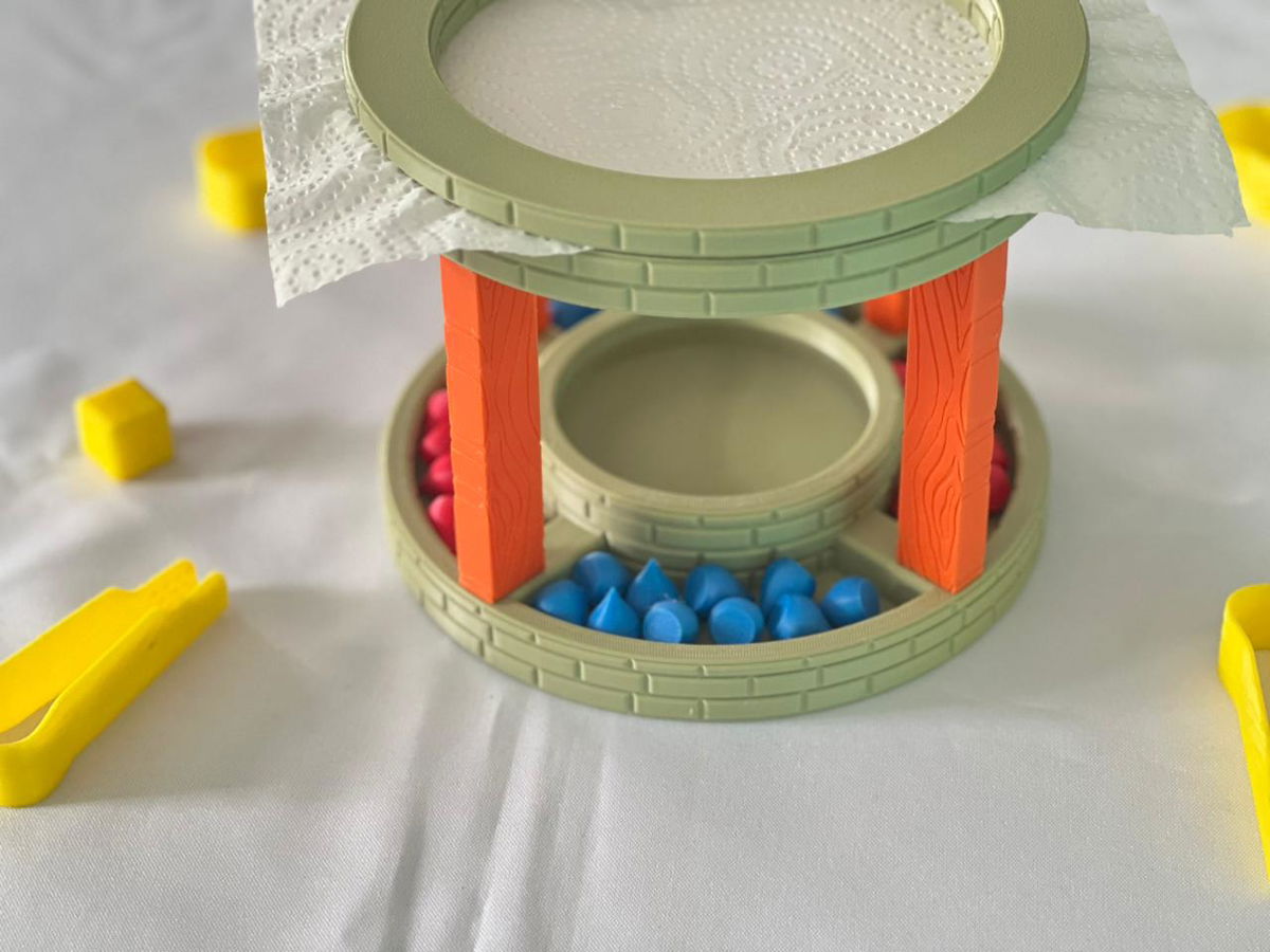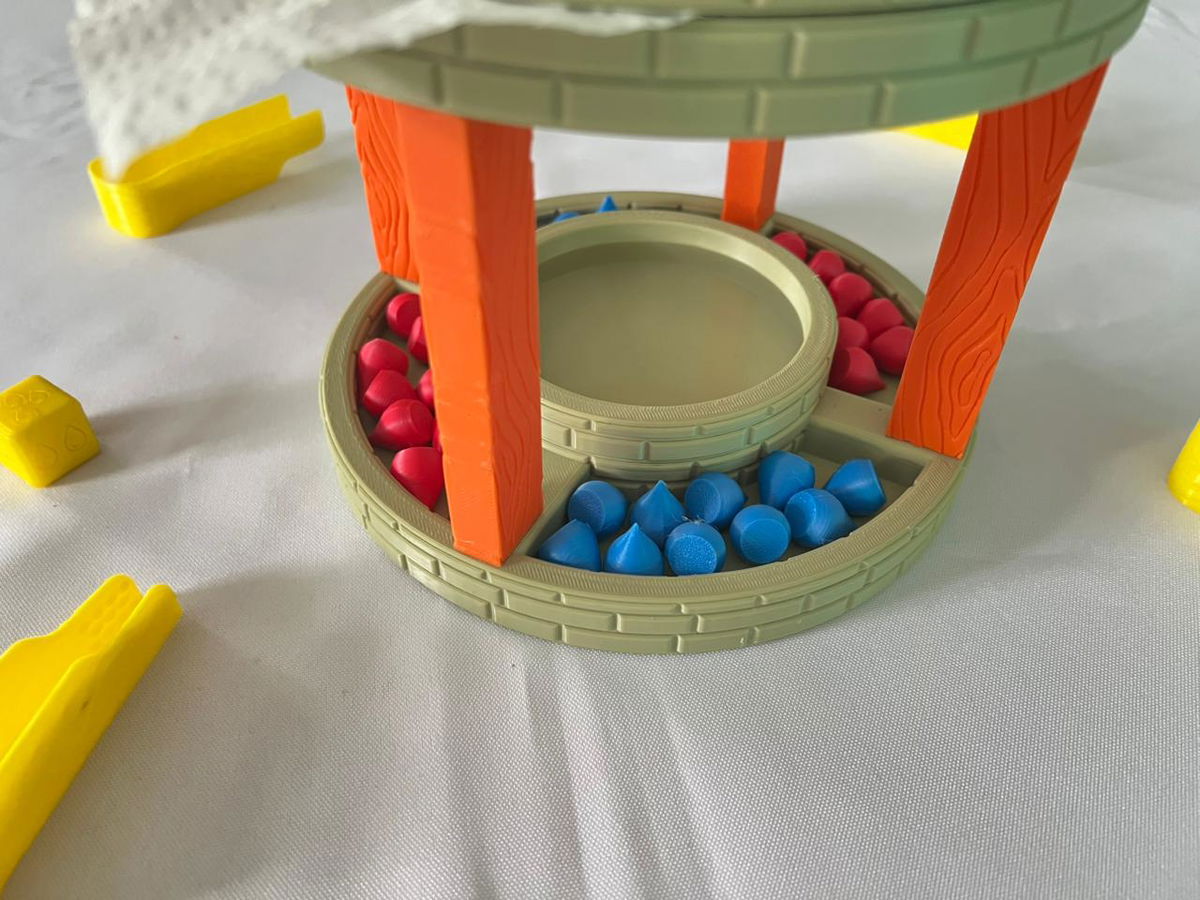👉 cuando sale azul, el jugador debe tomar una o varias fichas con la pinza, sumergirlas en el pozo, sacarlas mojadas y apoyarlas cuidadosamente sobre la servilleta de papel.