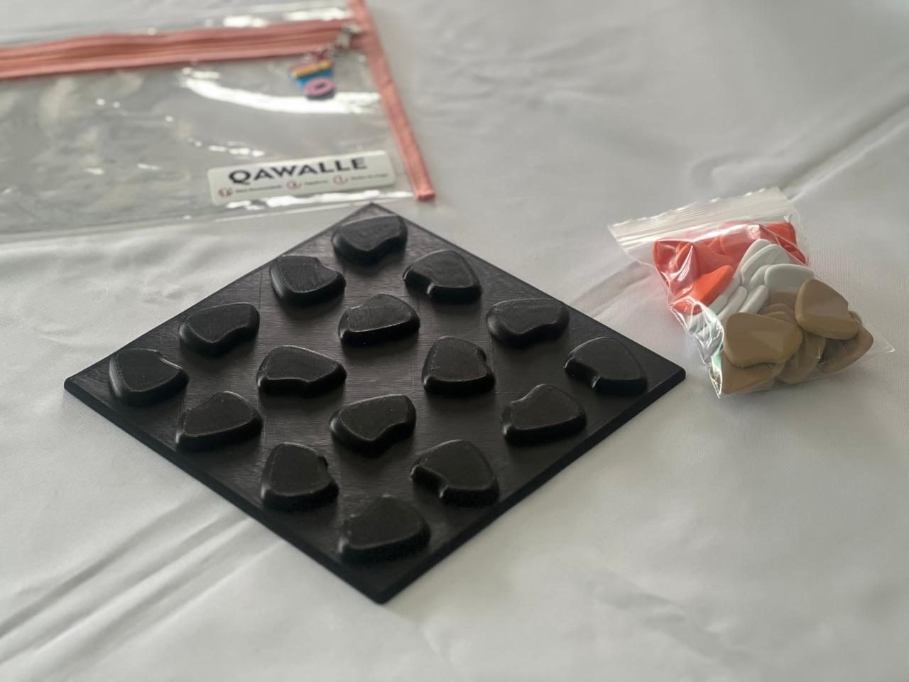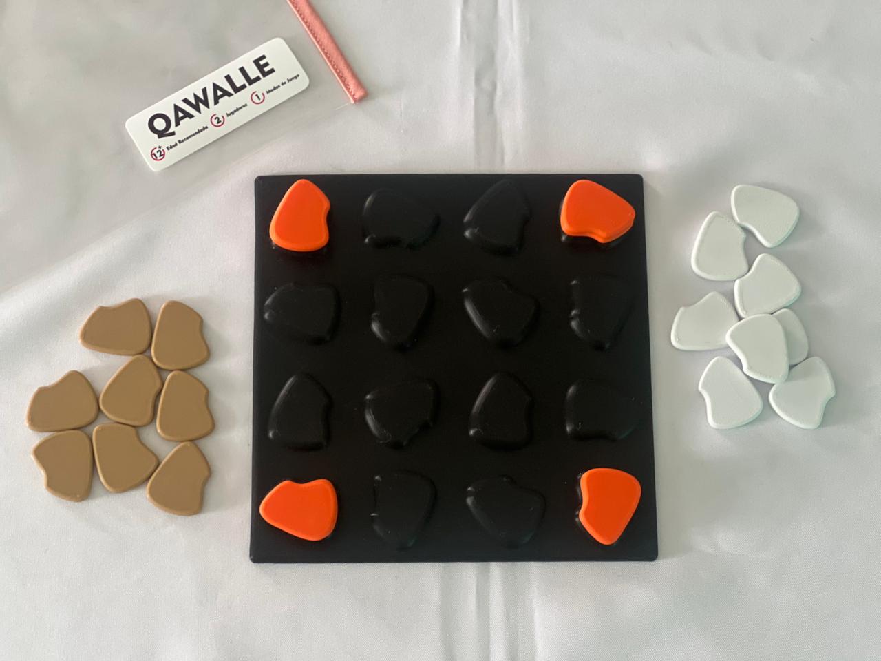 QAWALLE es un juego abstracto de estrategia donde cada pieza cambia el curso de la partida. En esta versión, los jugadores compiten con fichas blancas y marrones, mientras que las fichas naranjas funcionan como piezas neutrales que pueden bloquear, desviar o modificar cualquier plan.