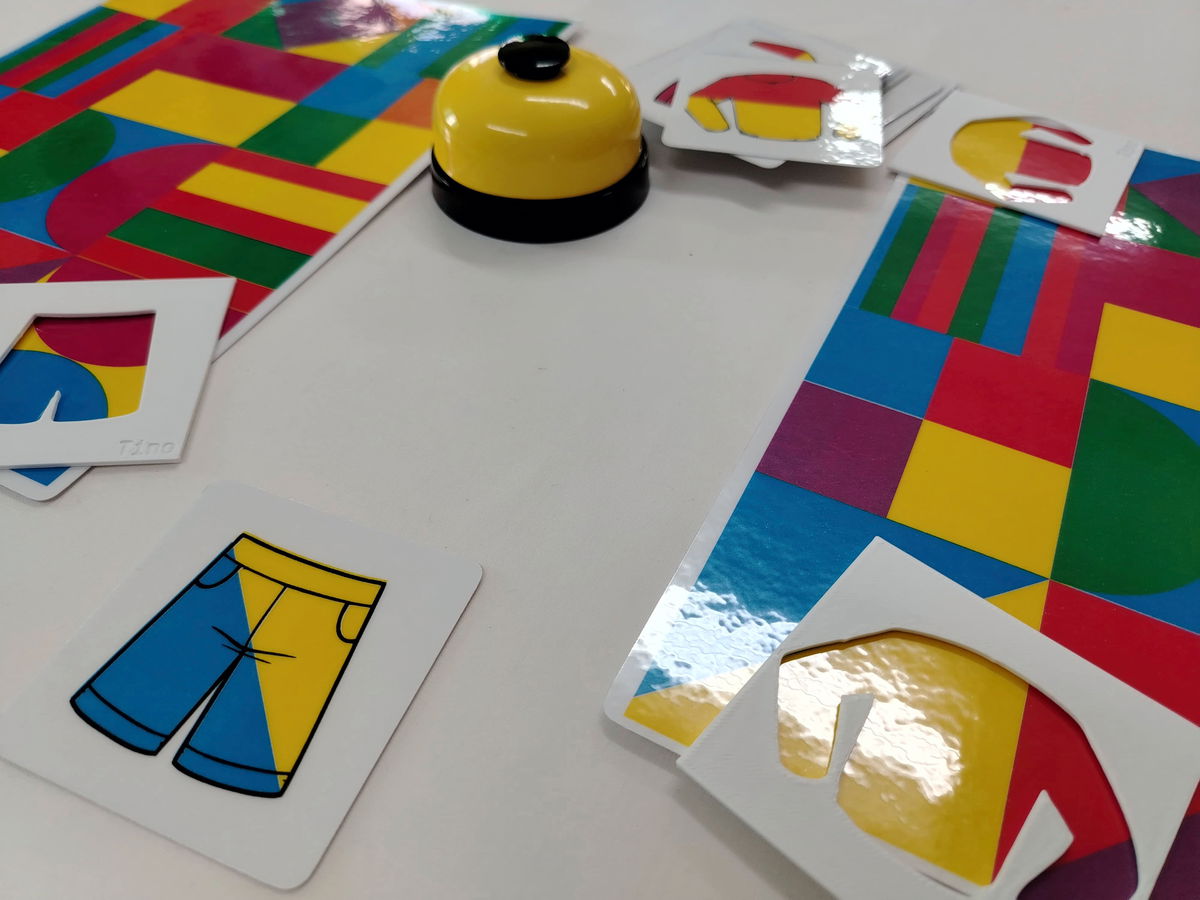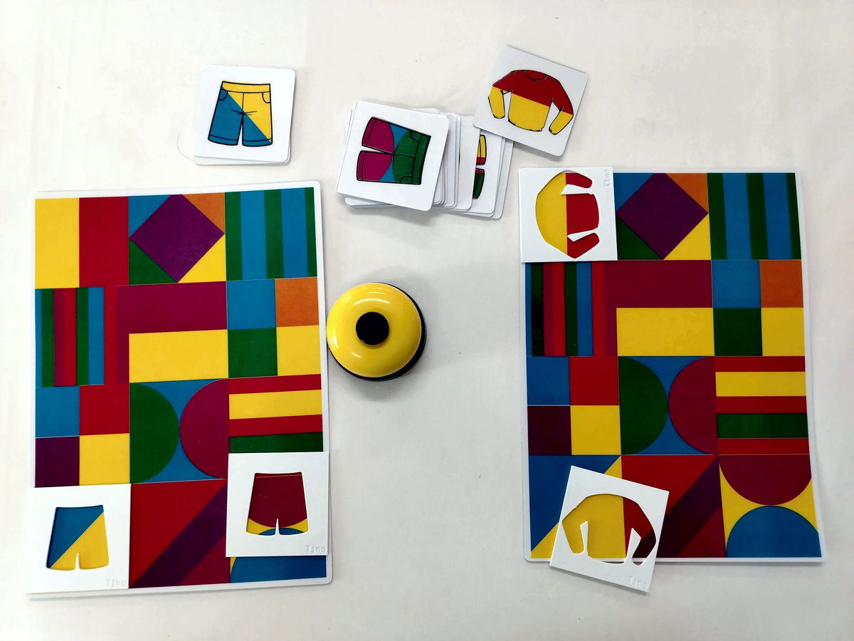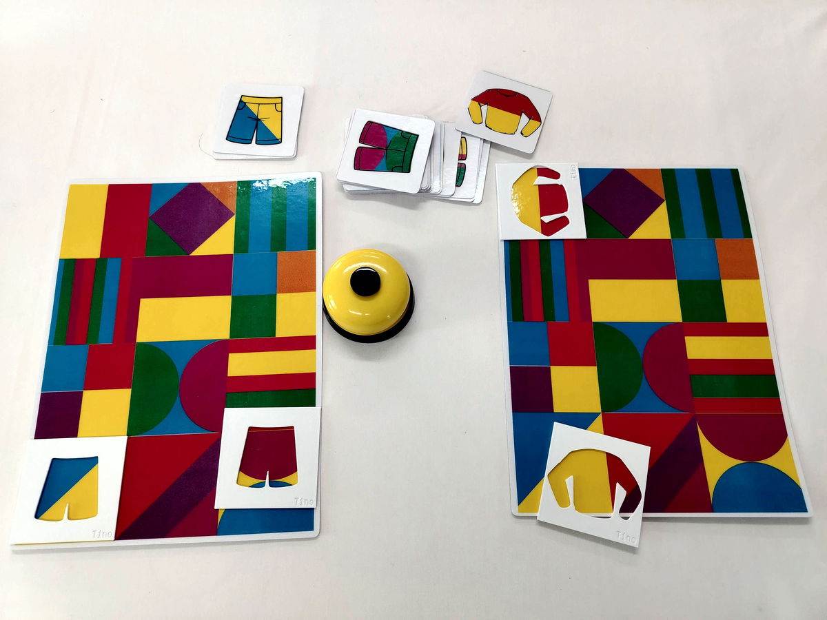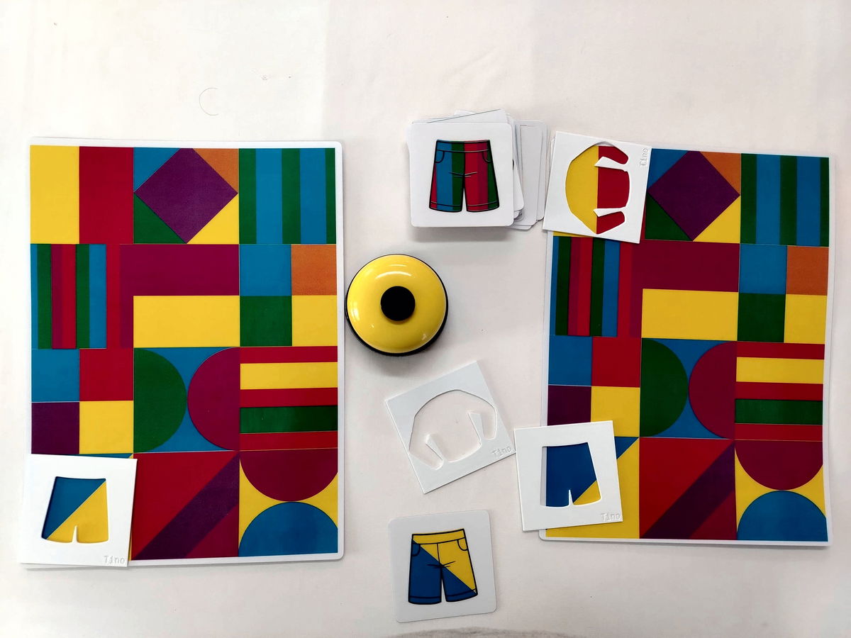 Los dos jugadores se sientan frente a sus respectivos tableros. Cada uno tiene dos fichas caladas: una con forma de pantalón y otra de buzo. Se revela una tarjeta con un patrón de colores que los jugadores deben reproducir en sus tableros utilizando las fichas caladas.