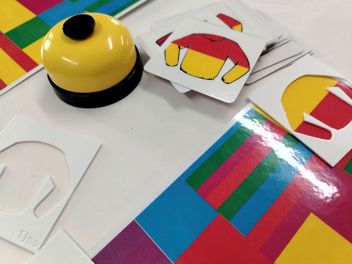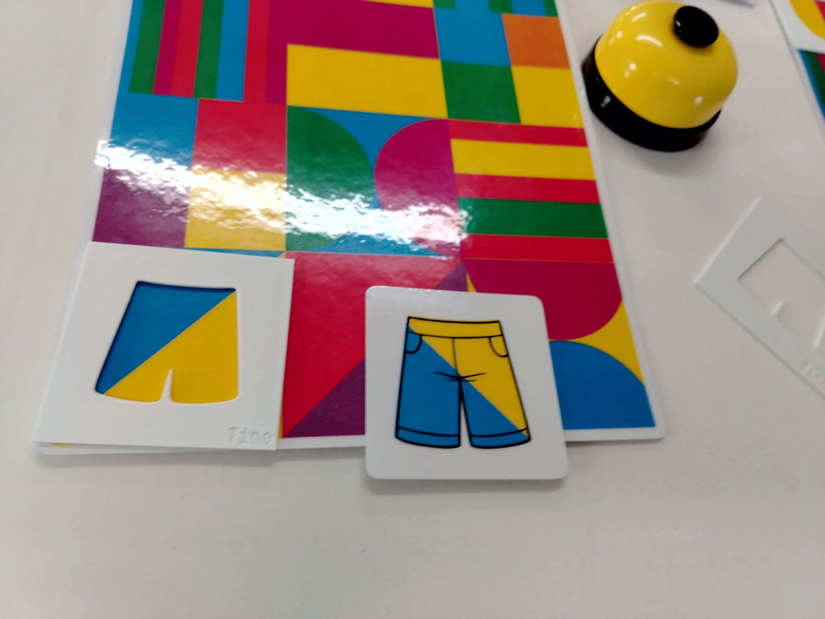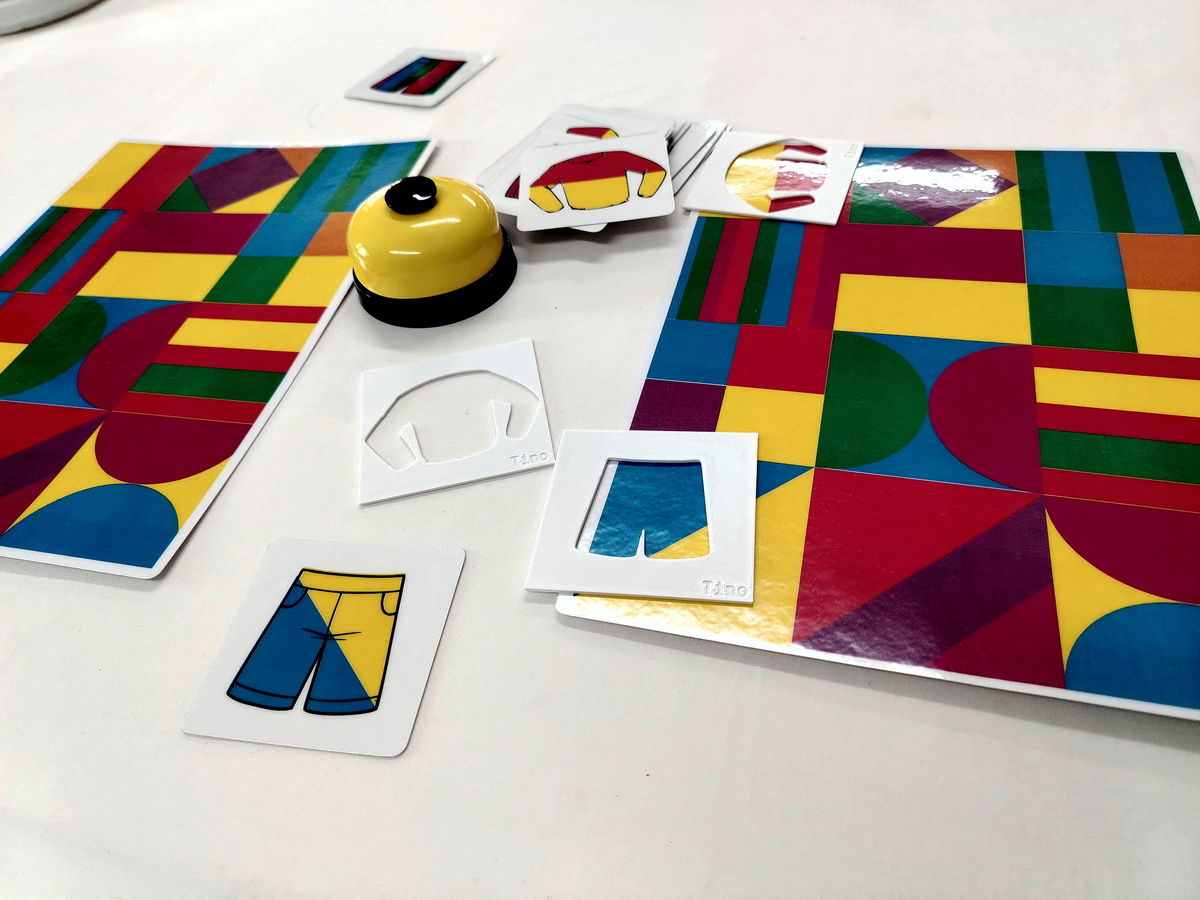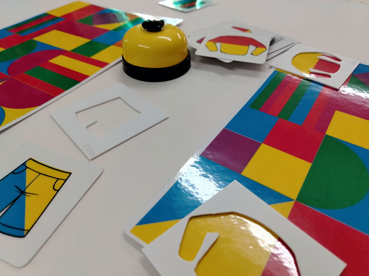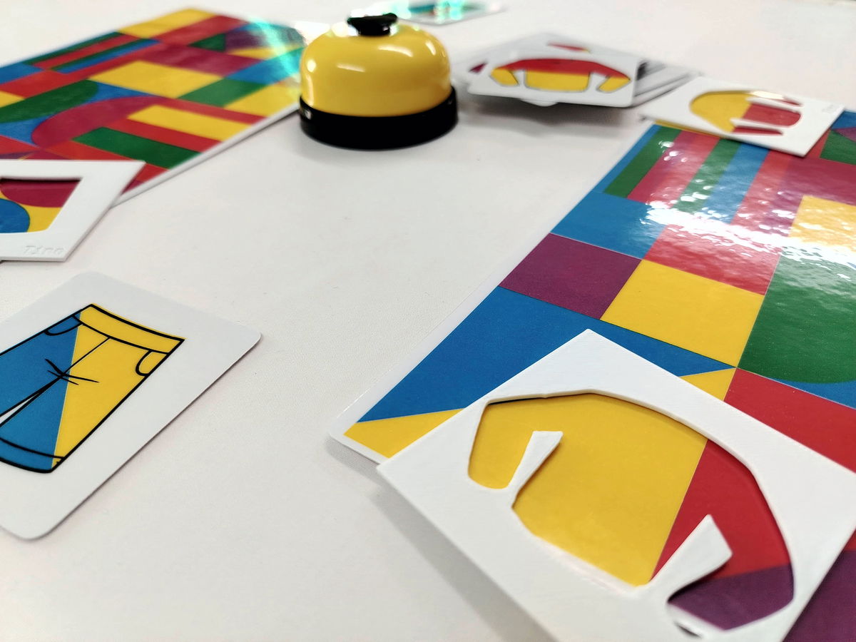 Los dos jugadores se sientan frente a sus respectivos tableros. Cada uno tiene dos fichas caladas: una con forma de pantalón y otra de buzo. Se revela una tarjeta con un patrón de colores que los jugadores deben reproducir en sus tableros utilizando las fichas caladas.