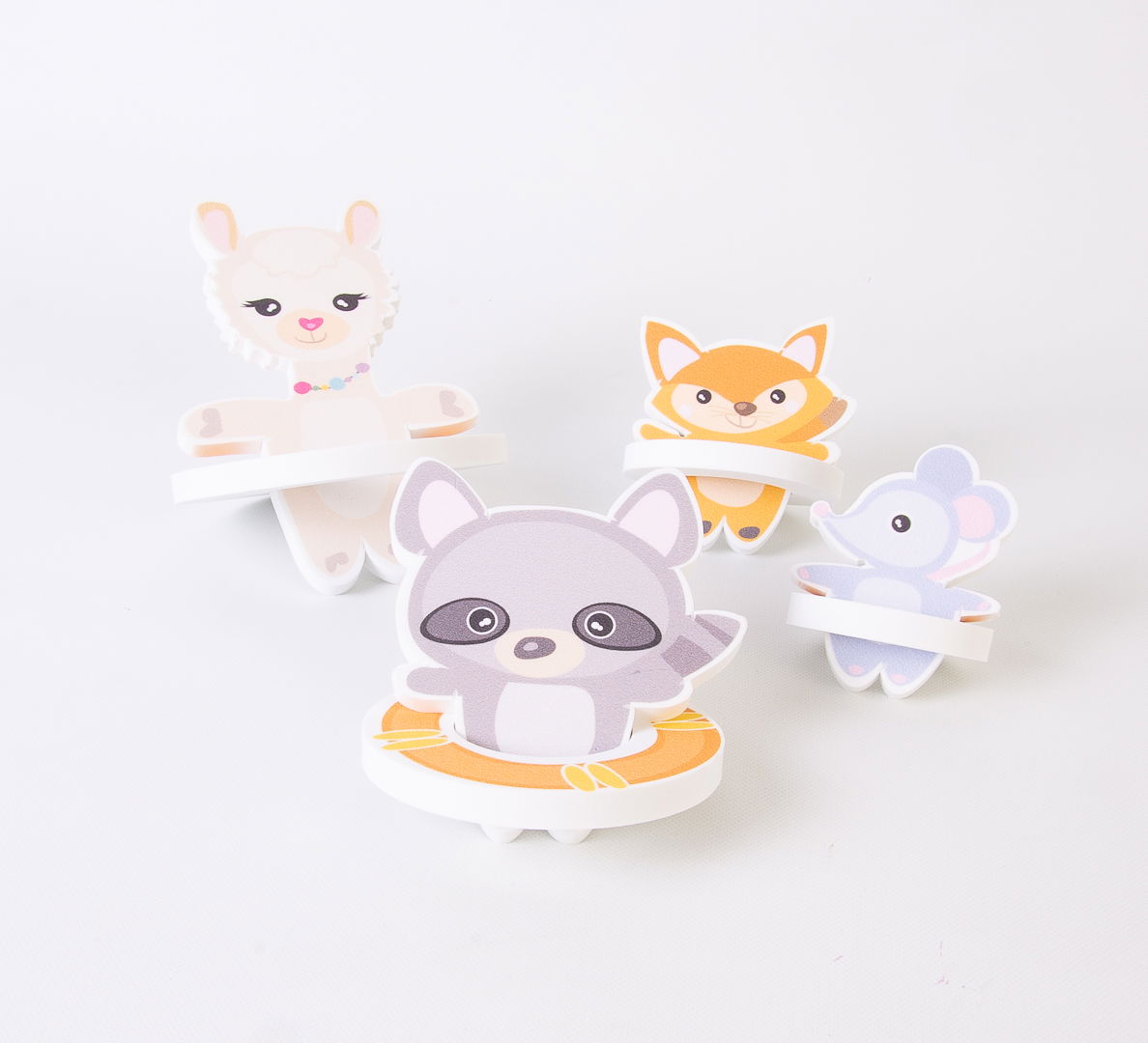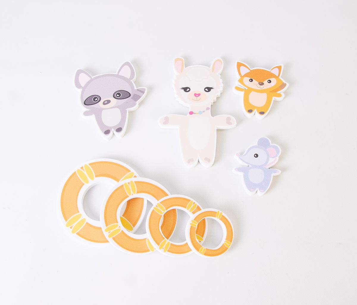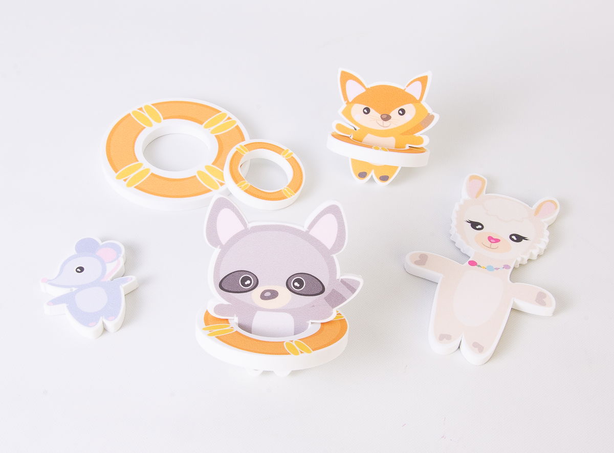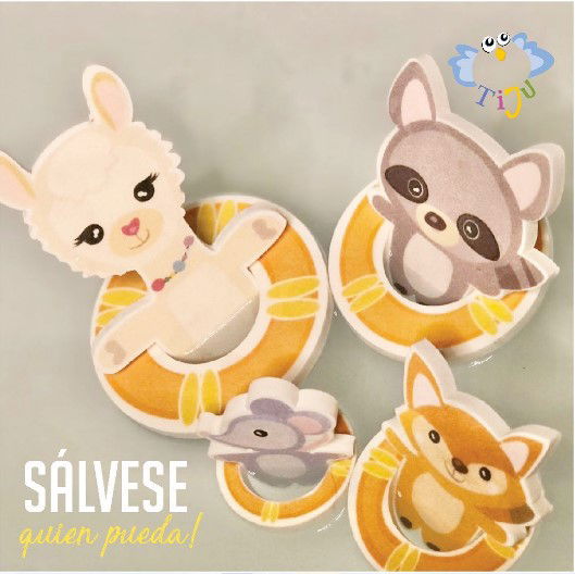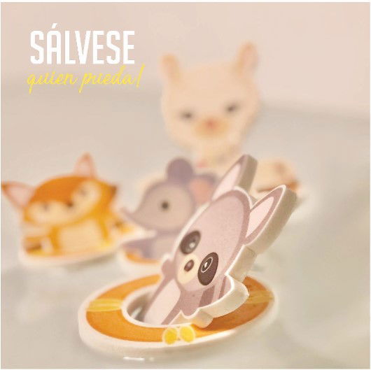 4 personajes y 4 salvavidas que miden entre 4 x 4cm. y 12 x 8cm