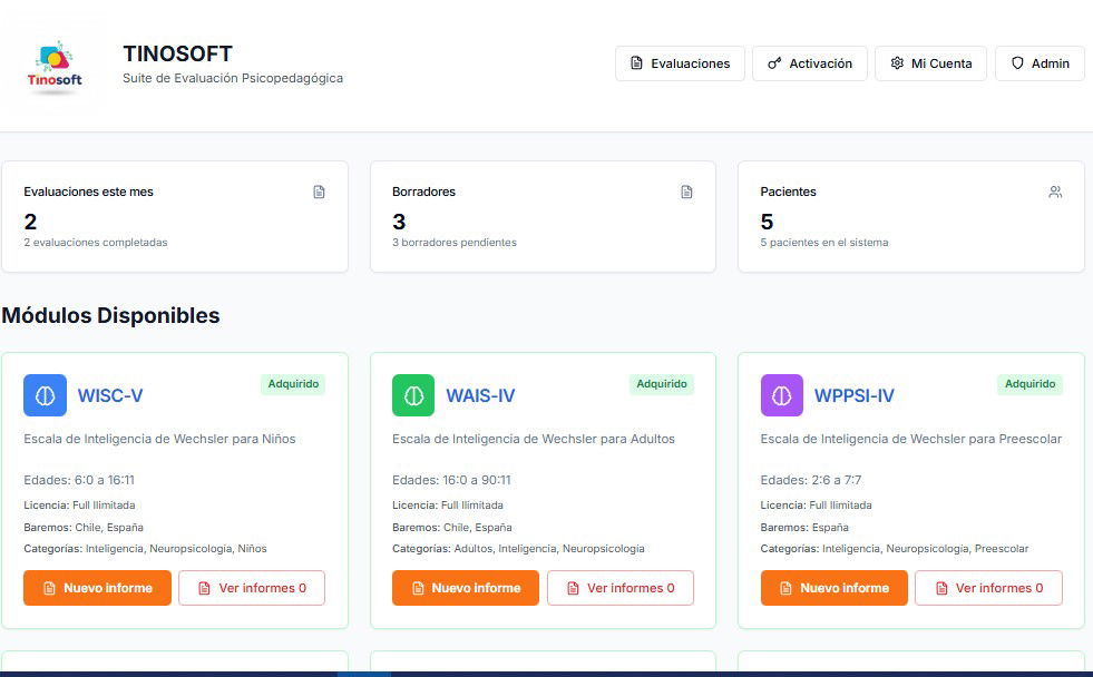 La SUITE TINOSOFT está compuesta por softwares de corrección digital diseñados para psicólogos, psicopedagogos y fonoaudiólogos, que permiten corregir, guardar y gestionar evaluaciones de forma profesional, segura y eficiente.